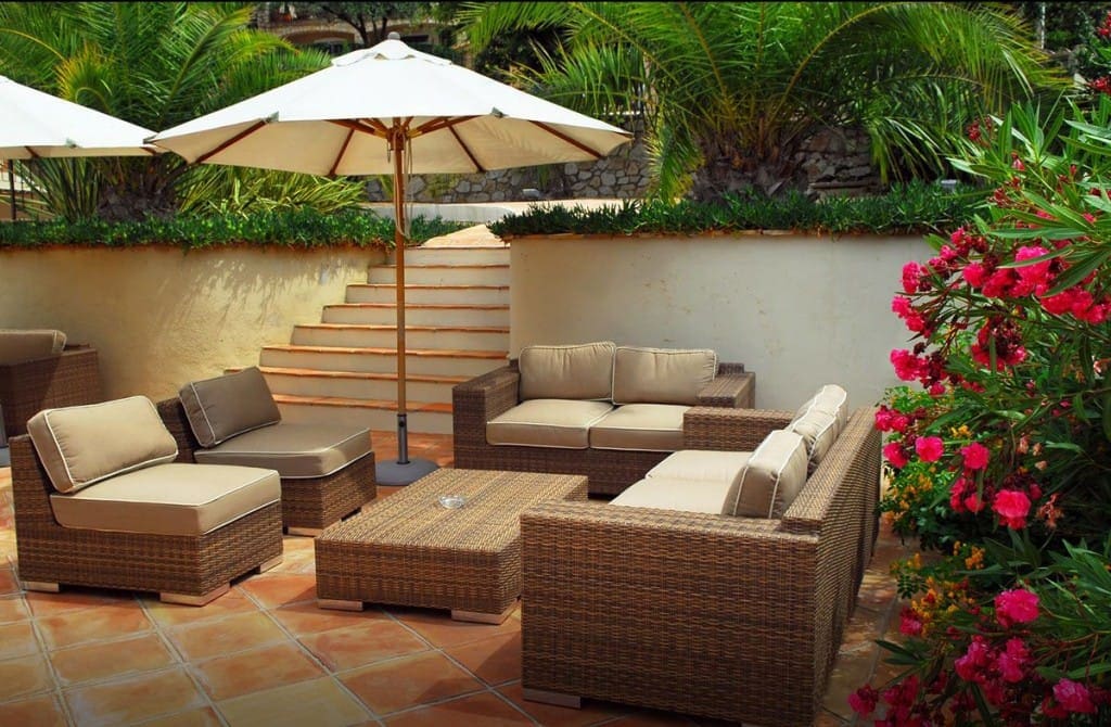 Cozy gathering place with wicker outdoor sofas and sectionals.